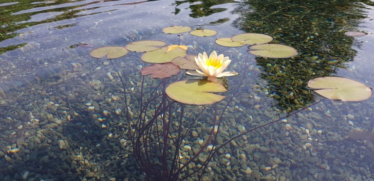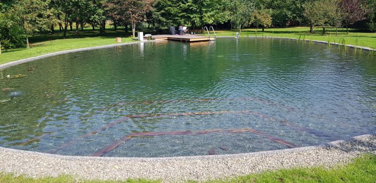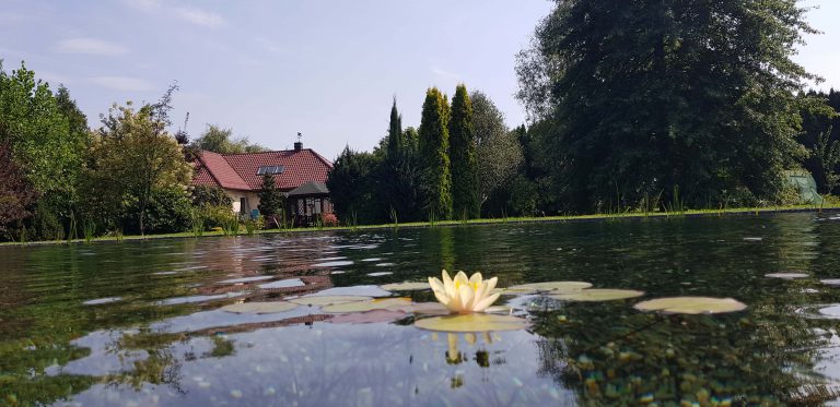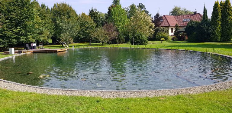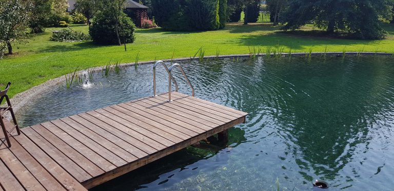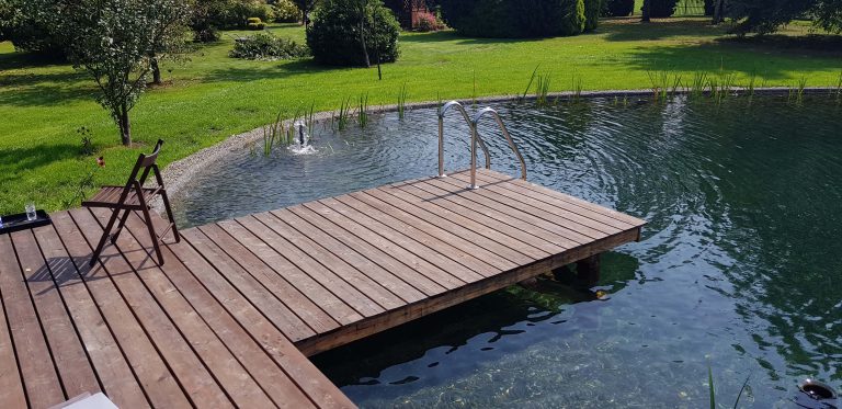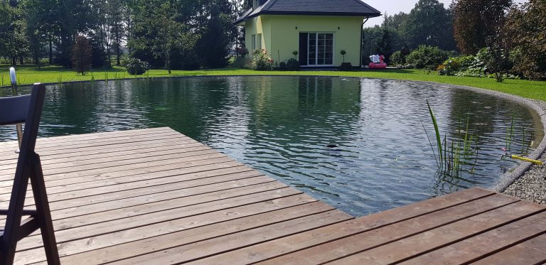 Naturalny staw kąpielowy na prywatnej posesji pod Pszczyną o wielkości 300 m2 lustra wody. Inwestorom zależało, aby uzyskać efekt naturalnego stawu. Pomost przeznaczony jest nie tylko do relaksu, ale również stanowi podest do skoków do wody. Głębokość stawu sięga 2.5 m.